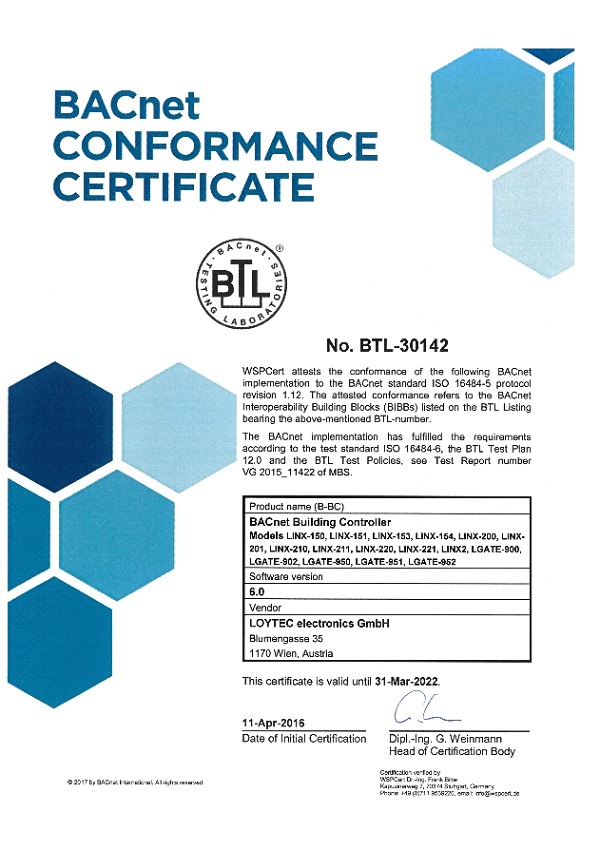Their product, the iSMA-B-FCU-HH fully programmable BACnet controller has been tested to the highest standards at the BACnet Laboratory Labs (BTL) and has been certified to the BACnet standard ISO 16484-5 protocol revision 1.14.