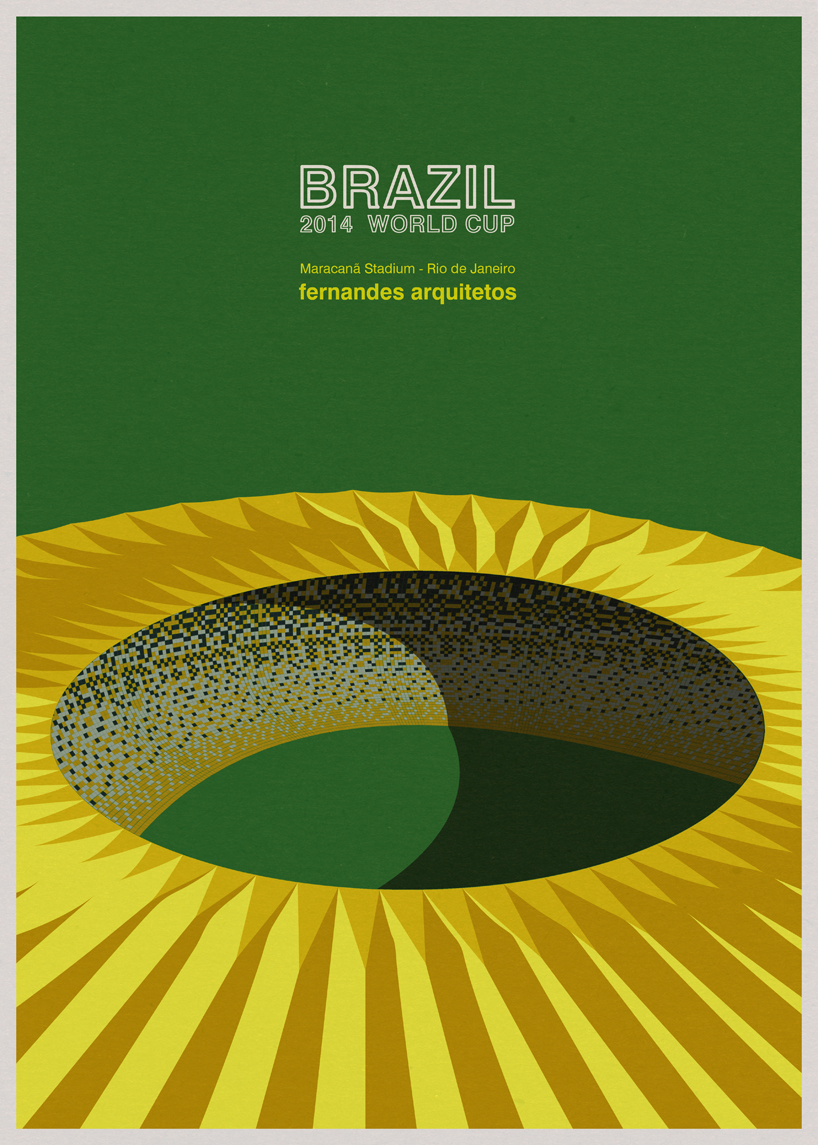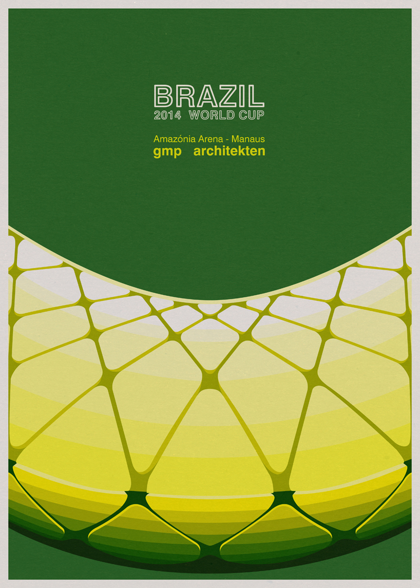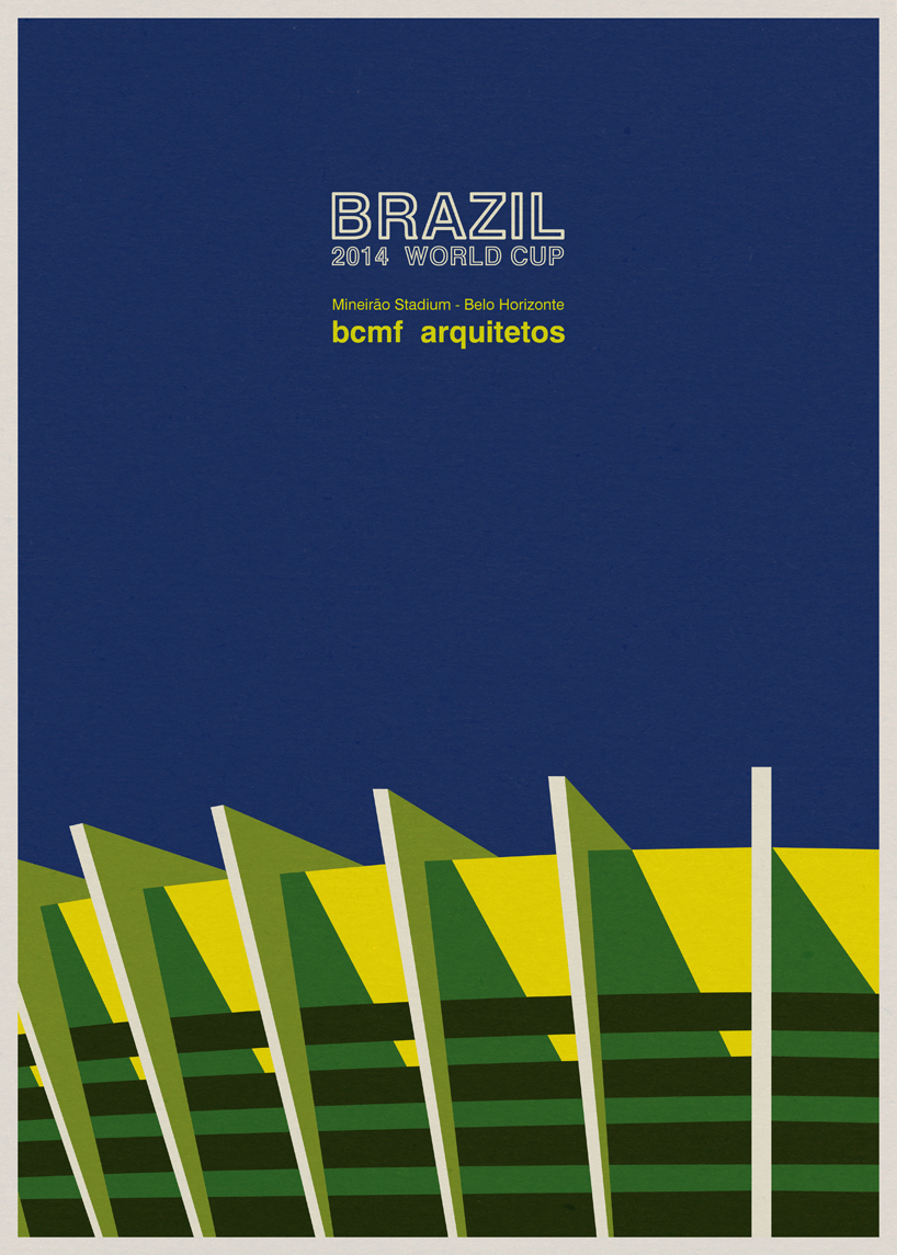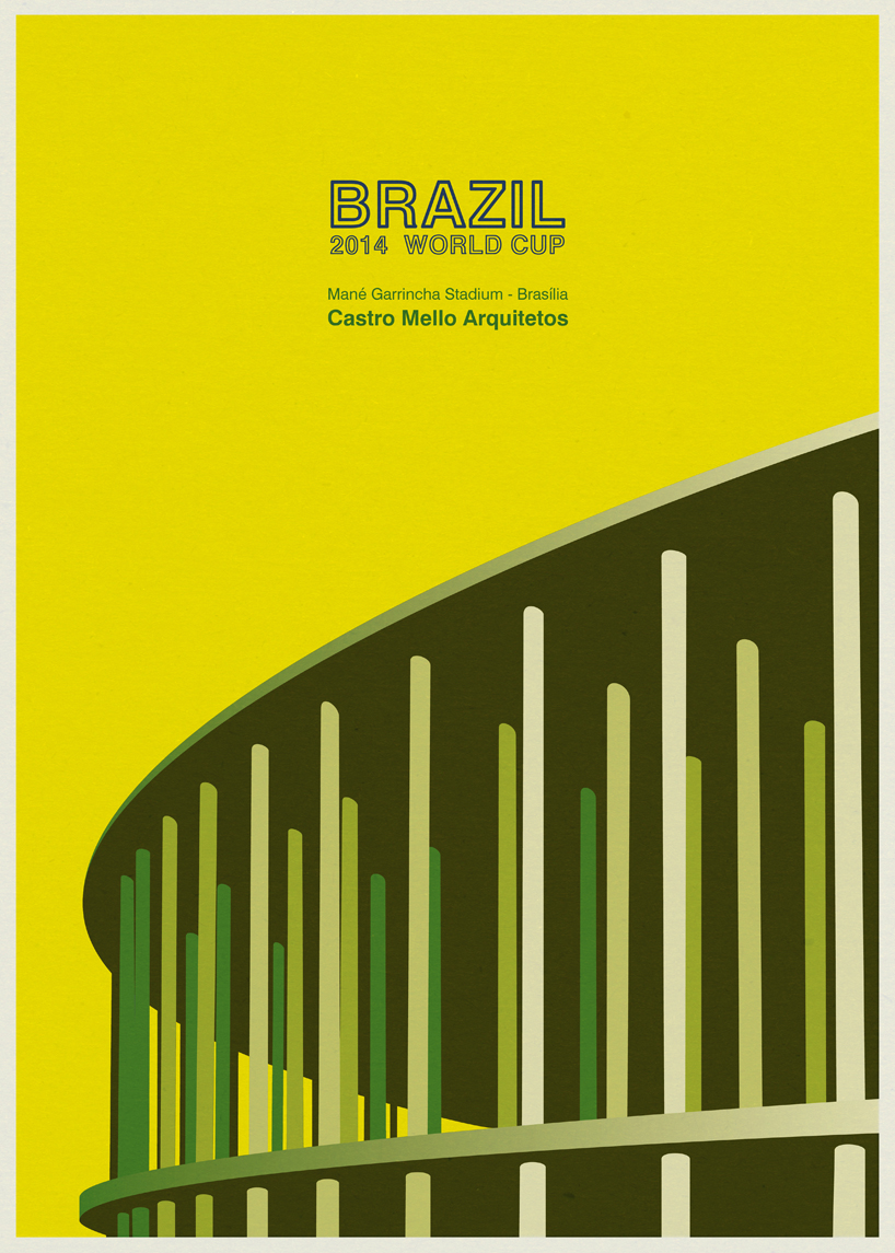 Andre Chiote, a Portuguese architect renowned for designing illustrations that represent some of architecture’s most iconic buildings has created master piece illustrations for the newly-built stadiums constructed for the 2014 world cup in brazil. The poster illustrations are colorful aesthetic – in Brazilian green,yellow and blue.