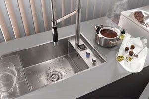 The first electronic product solution for the kitchen eUnit Kitchen offers high functionality and convenience for the professionalized kitchen workspace. With the sink-integrated variation, the controls blend together to create a single unit, leaving the countertop free for food preparation and placement of kitchen objects.