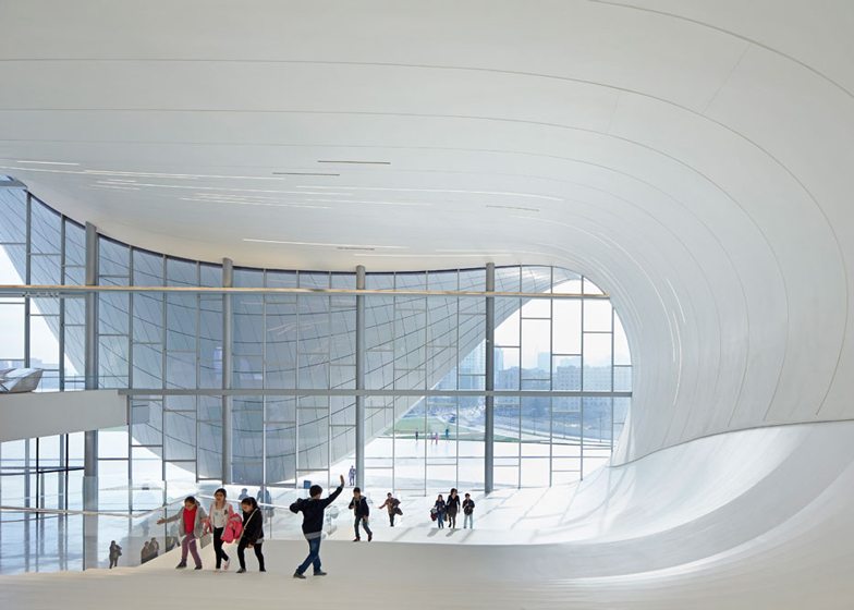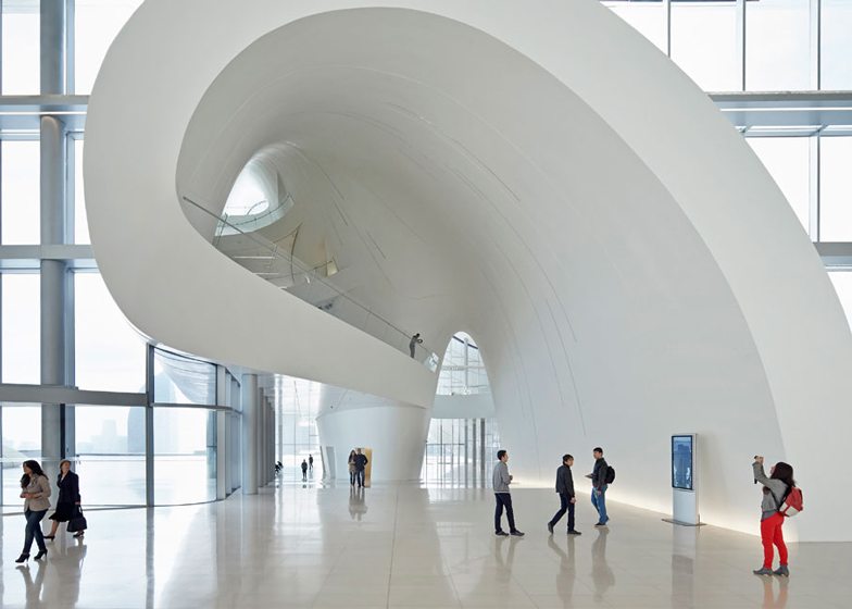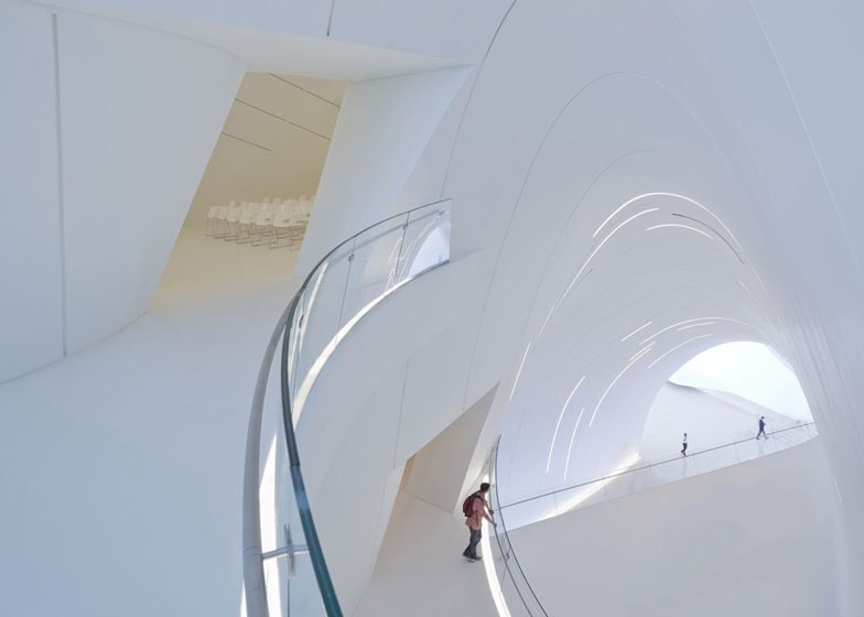 The centre, which contains exhibition spaces, a library, a museum and concert venues, is set in a public plaza, the ground of which rises up to form the building’s wave-like shell.