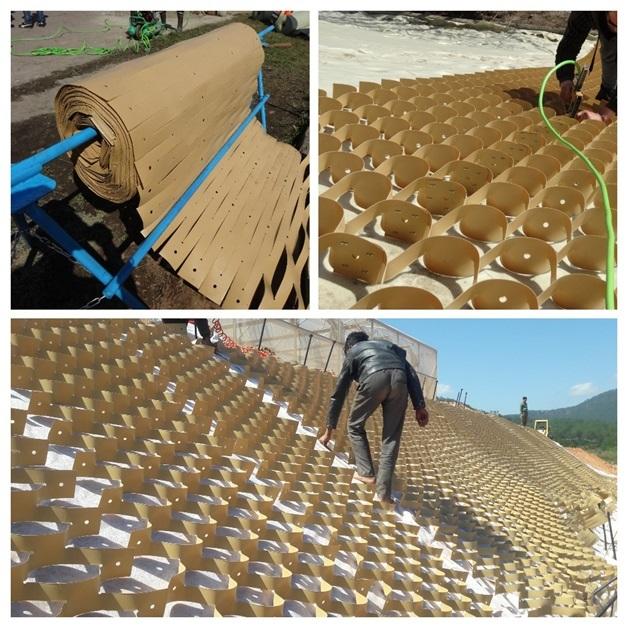 Geotextile mattress for slope protection”For example, various geosynthetics enable re-use of waste materials and site-won materials (such as ash, slag, poor quality soil etc.). Essentially, it allows for use of locally (possibly marginal) soils and material. This minimizes the effort, costs, and environmental impact produced by importing material from elsewhere,” he adds.