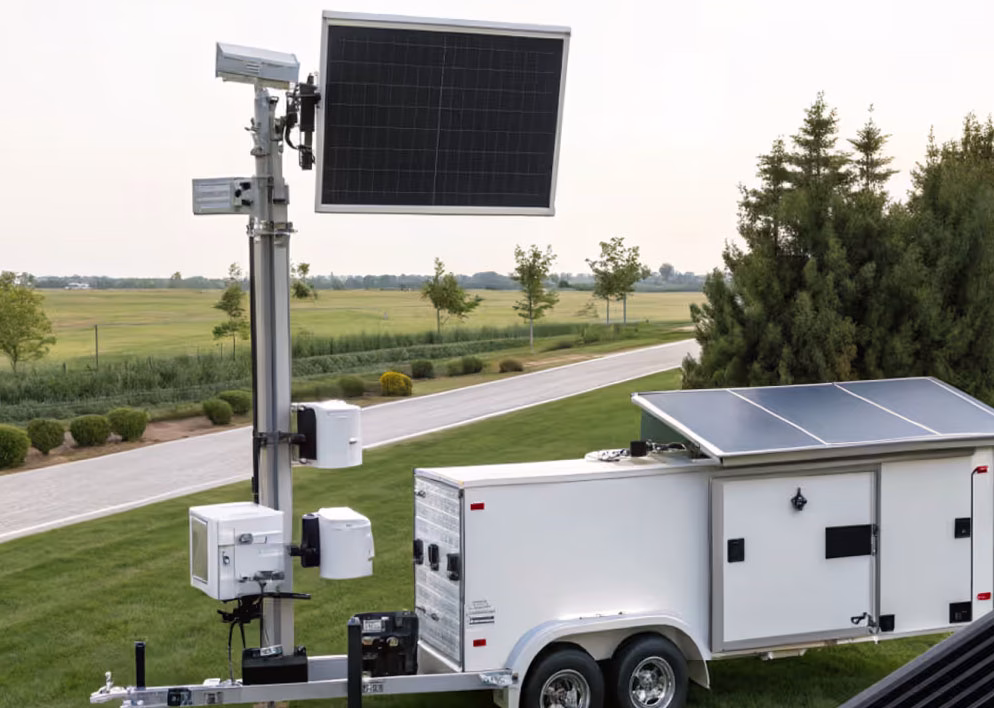 Think of it as a mobile, off grid security stack in a towable chassis. A PV array charges a LiFePO4 battery bank that is sized to give you multiple days of autonomy. A telescopic mast carries PTZ and fixed cameras, sometimes thermal. An edge computer on board runs AI analytics so you only transmit events, not every pixel. Backhaul is usually LTE or 5G, but Starlink or microwave is common on very remote sites. The whole unit can be dropped, leveled, configured and live in hours, then redeployed to the next project when you energize and move on.
