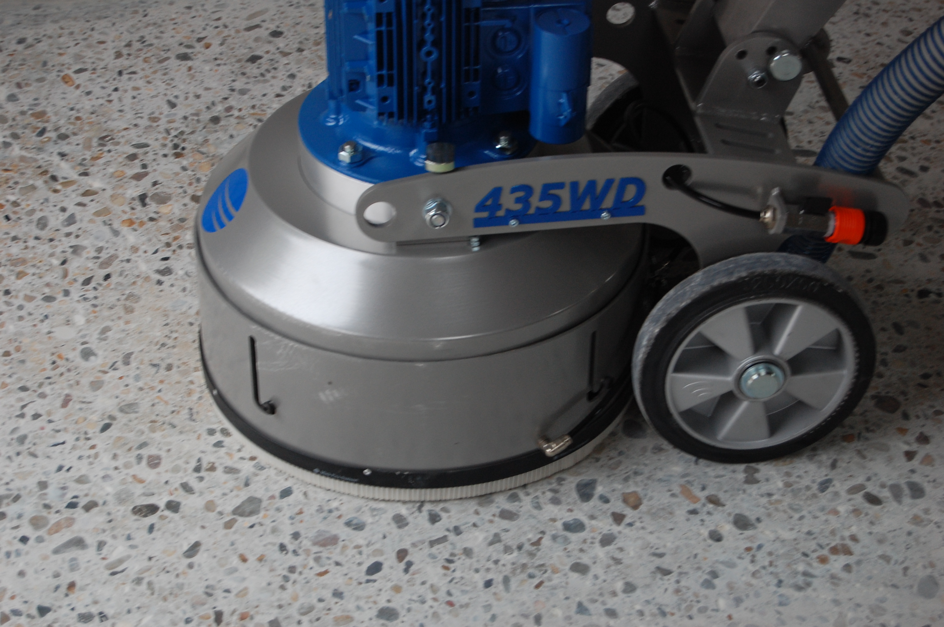 As soon as the topping has hardened and is ready to work-up, the grinding process begins with diamond grinding machine, and progressively repeated, each time increasing the fineness of the grit until it reaches the 120-grit metal segment.