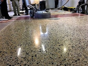 To achieve a glossy floor, ceiling, wall or even counter top, the surface will have to be converted from its concrete form and exposed to a Bonded Abrasive Polished Concrete, Burnished Polished Concrete, or Hybrid Polished Concrete. The results either, a dust-proof, glossy surface that is easy to maintain and clean with a custom brightness that is abrasion resistant and most of all appealing to look at.