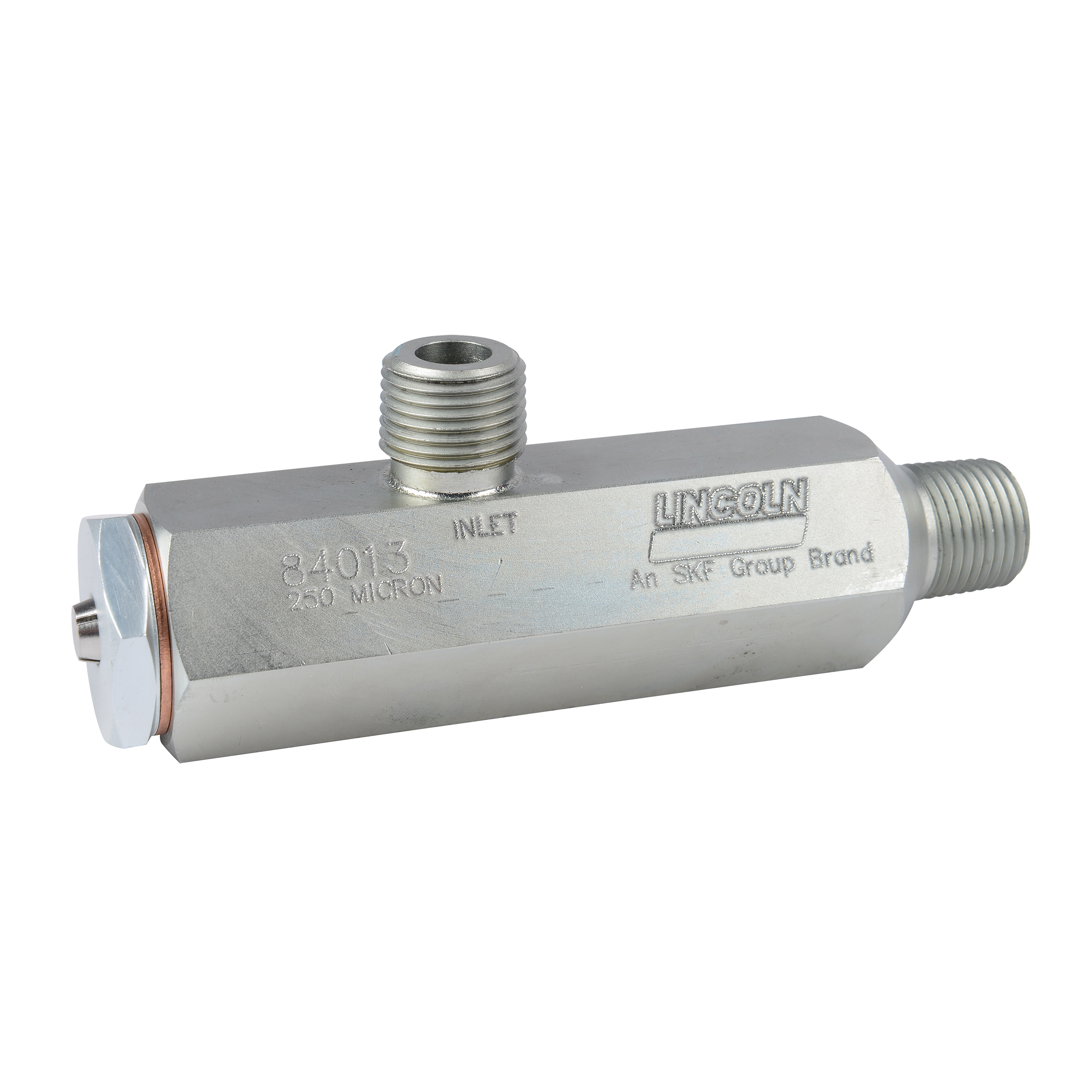 The easy-to-install Lincoln small grease reservoir filling filter is available with either a 250- or 500-micron, crush-proof filter element, which is simple to clean. It has a fill rate of up to 8 liters/min (2 gal/min)* and operating pressure of 344 bar (5,000 psi). The filter’s compact size makes remote mounting from the reservoir possible.